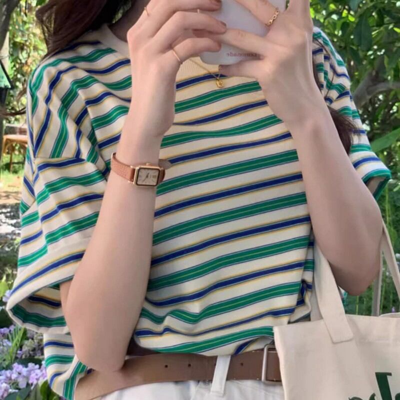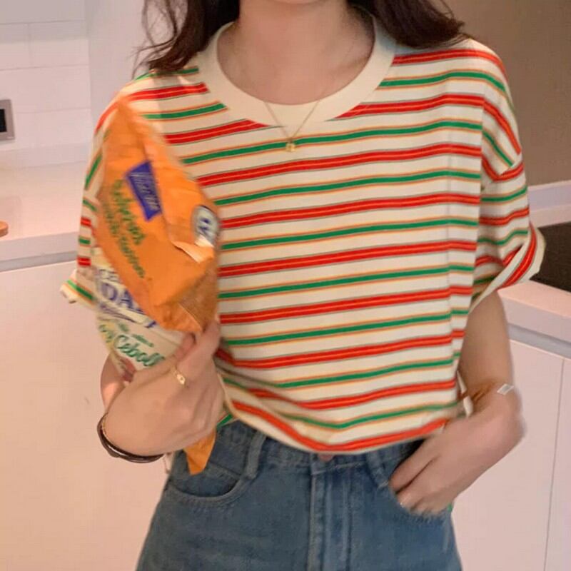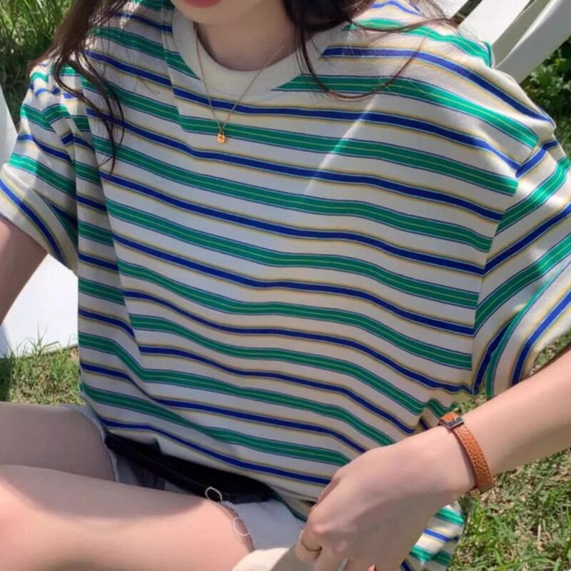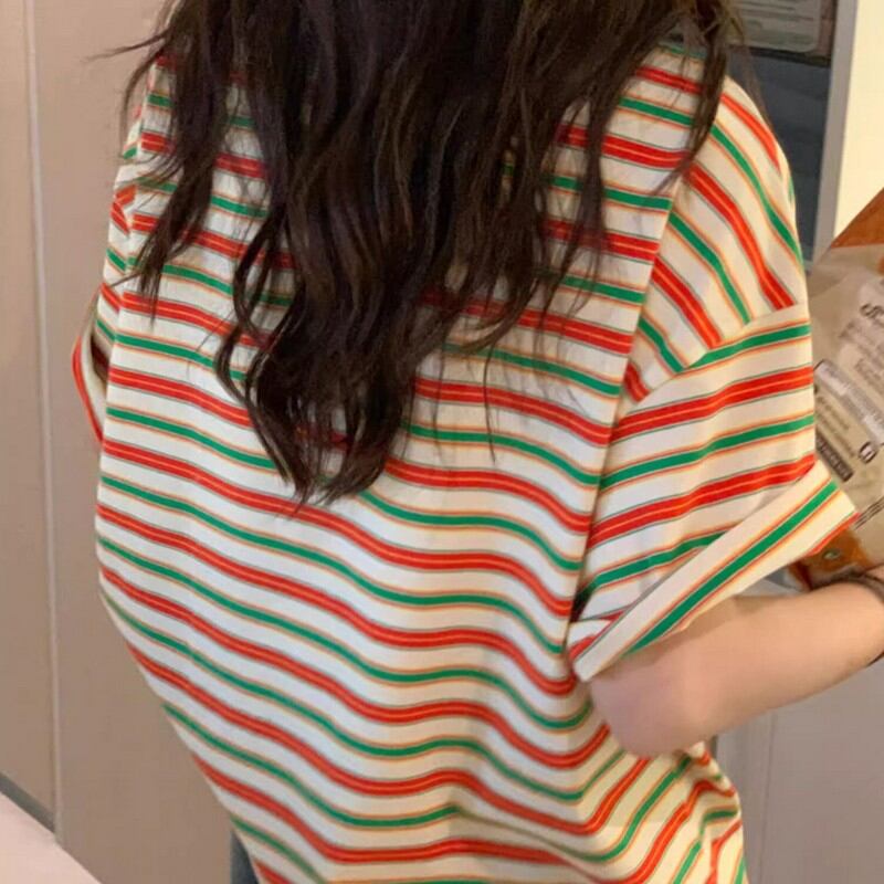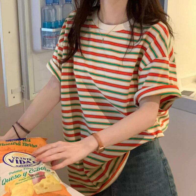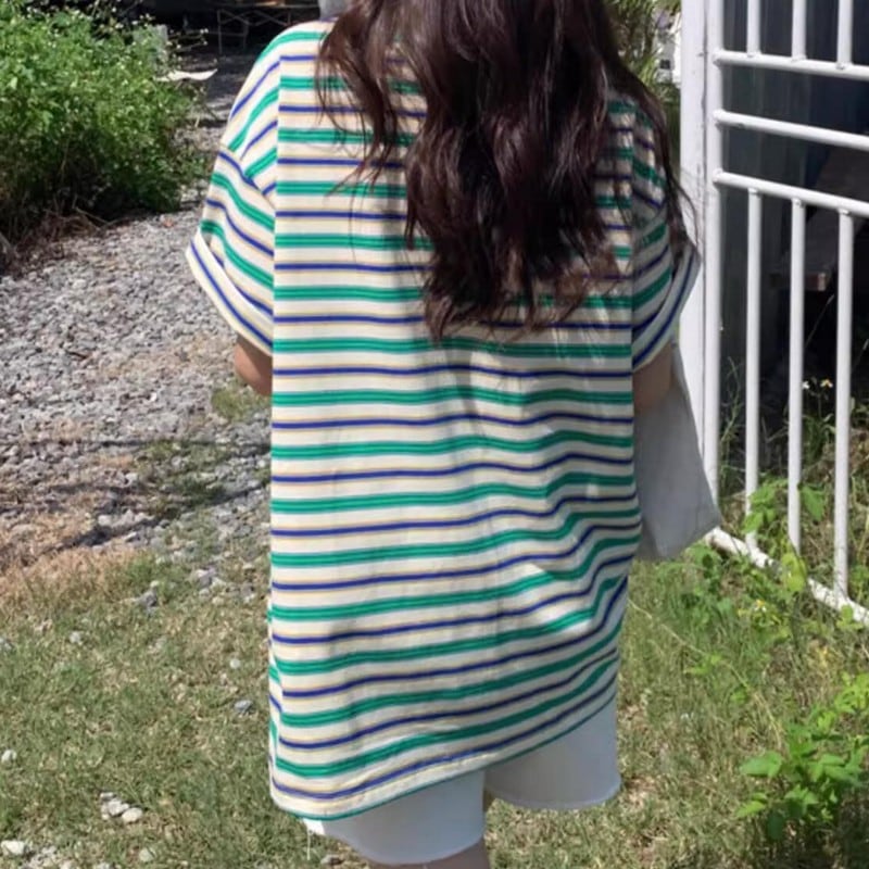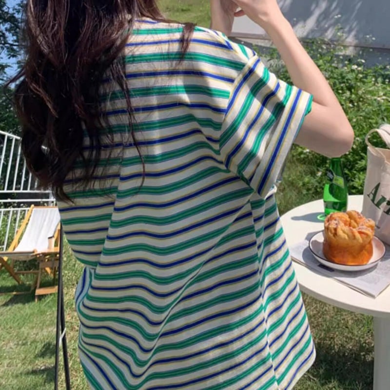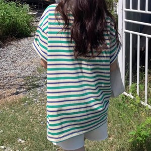 涼しげなボーダー柄のTシャツです。ルーズなシルエットとシックなカラーマッチングが、女性らしさとこなれ感を演出します。半袖で軽やかに着こなせるので、暑い季節にぴったりです。