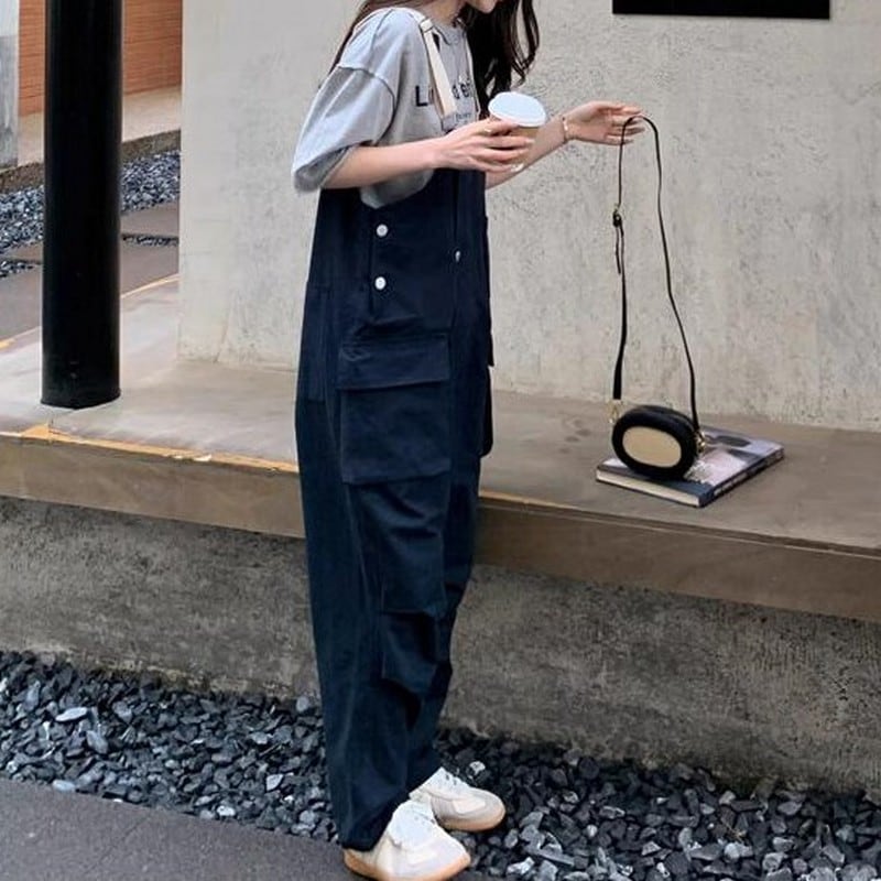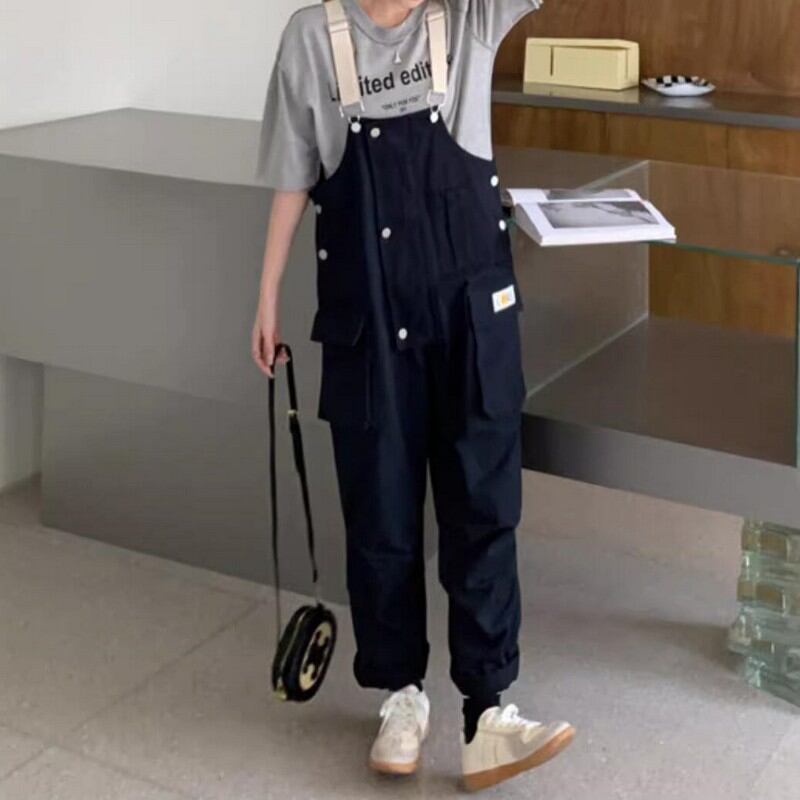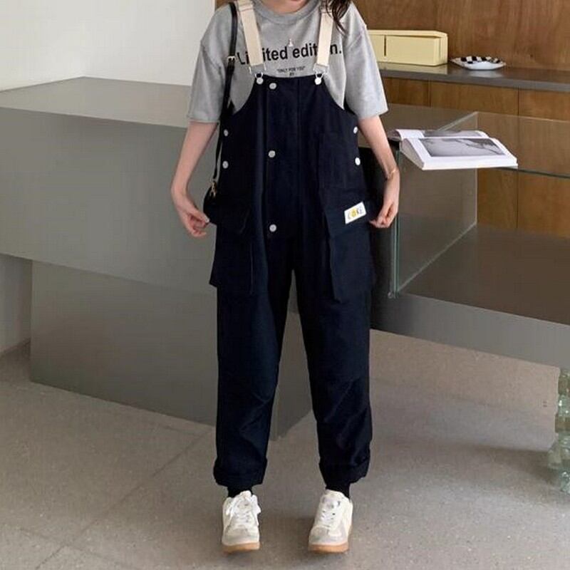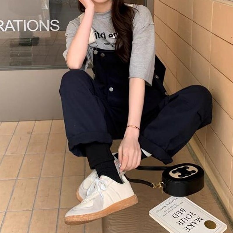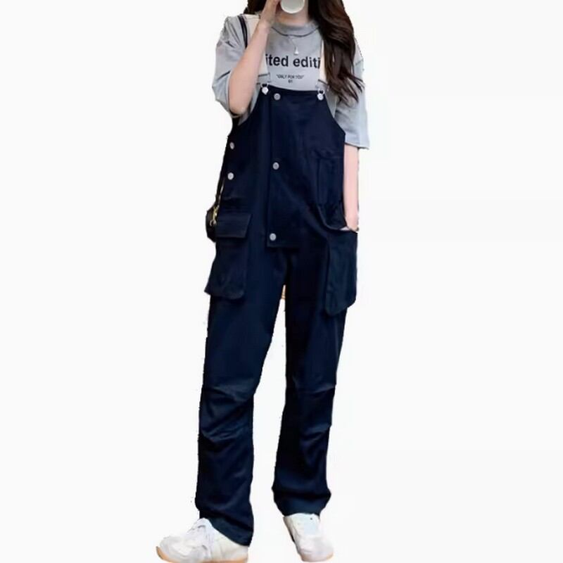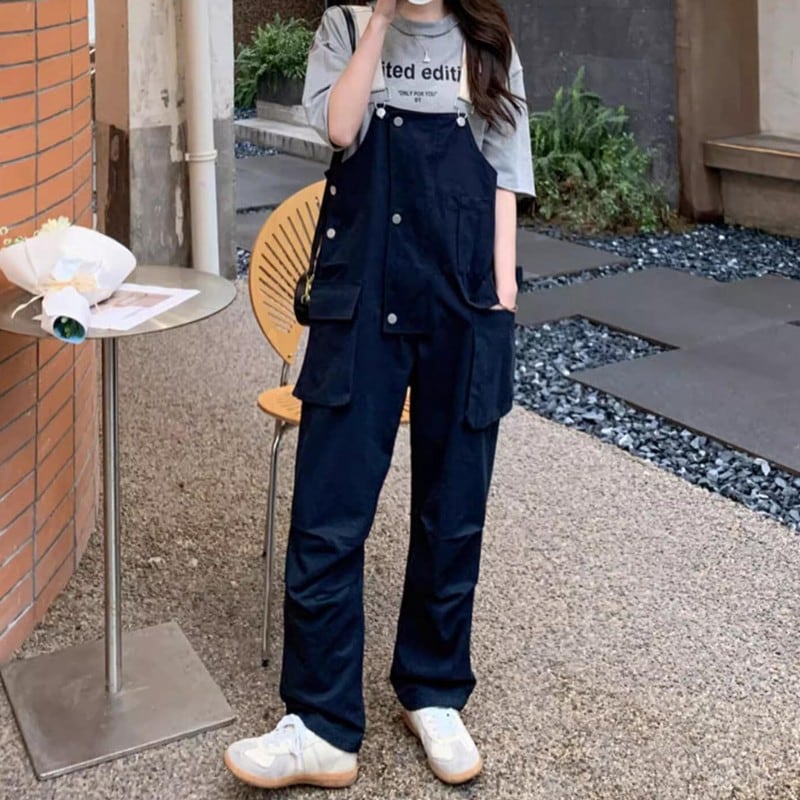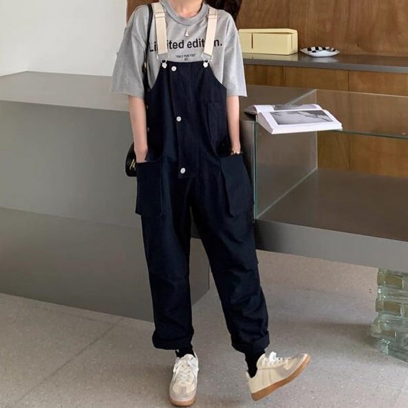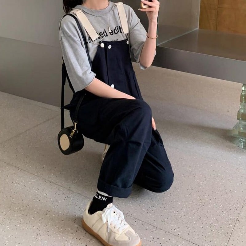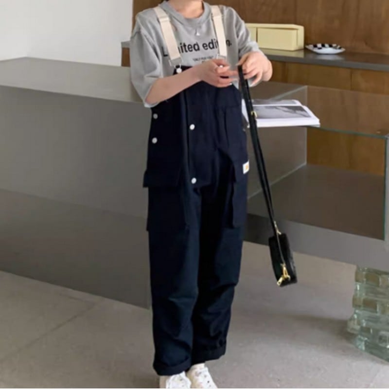 折り返しデザインのボタンと肩紐の素材チェンジのオーバーオールは、縦のラインを強調することで、スタイルアップ効果も期待できます